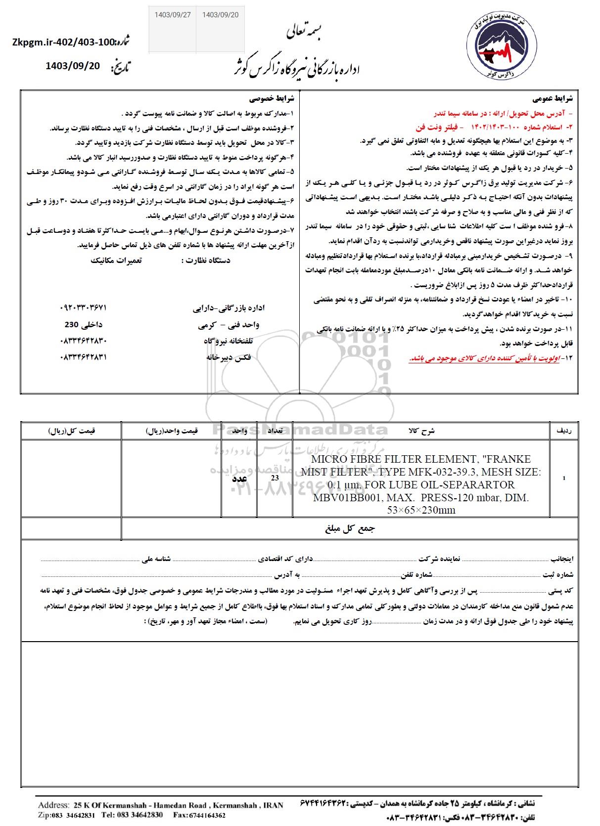 2- استعلام شماره 100-1402/1403 - فیلتر ونت فن