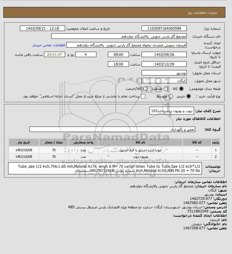 شرح کلی نیاز: تیوب و یونیون برای واحد103