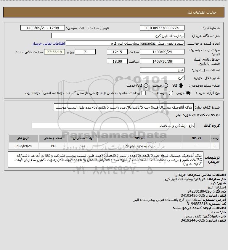 شرح کلی نیاز: پلاک آناتومیک دیستال فیبولا چپ 3/5تعداد70عدد راست 3/5تعداد70عدد طبق لیست پیوست