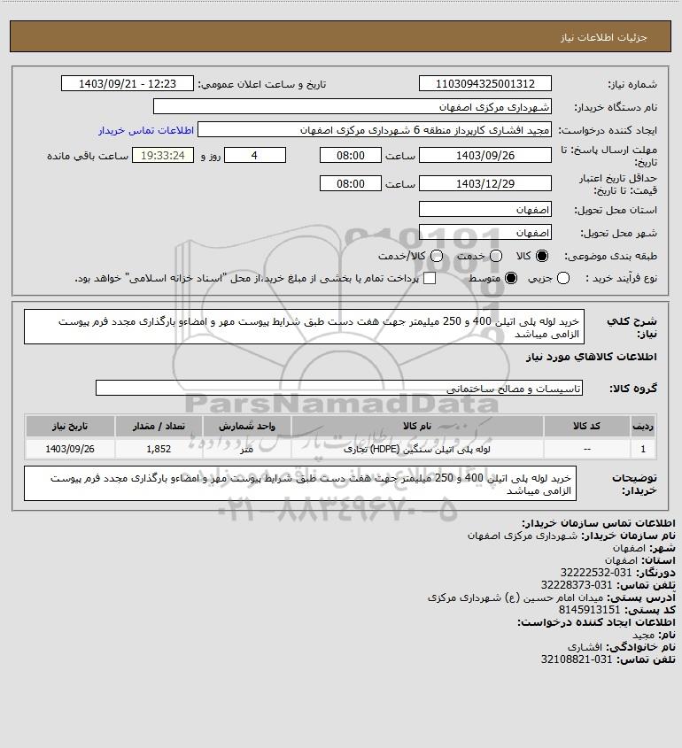 توضیحات خریدار:خرید لوله پلی اتیلن 400 و 250 میلیمتر جهت هفت دست طبق شرایط پیوست مهر و امضاءو بارگذاری مجدد فرم پیوست الزامی میباشد