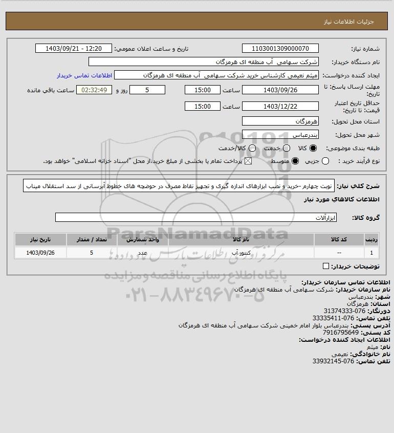 شرح کلی نیاز: نوبت چهارم -خرید و نصب ابزارهای اندازه گیری و تجهیز نقاط مصرف در حوضچه های خطوط آبرسانی از سد استقلال میناب
