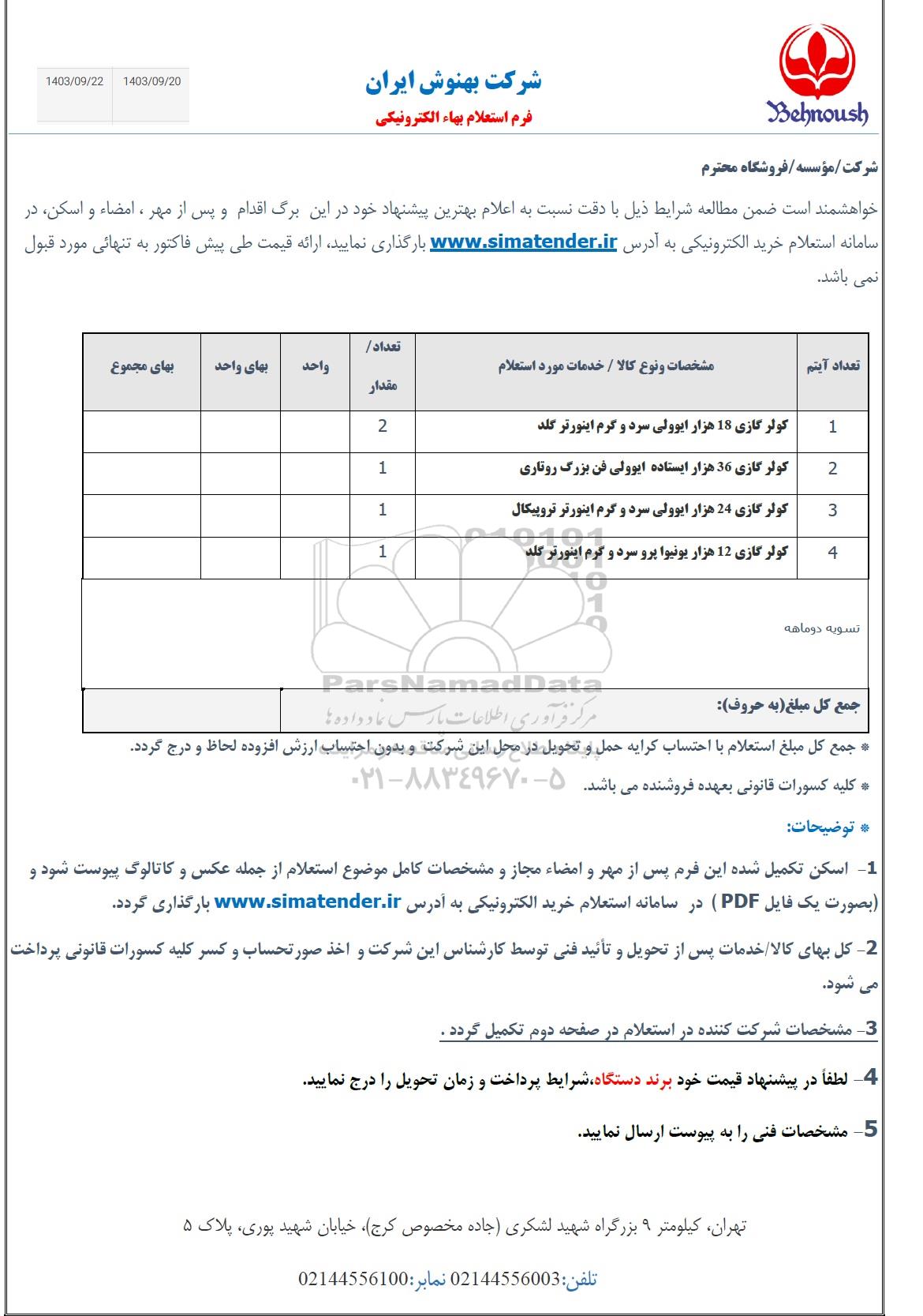خواهشمند است ضمن مطالعه شرایط ذیل با دقت نسبت به اعلام بهترین پیشنهاد خود در این برگ اقدام و پس از مهر ، امضاء و اسکان در سامانه استعلام خرید الکترونیکی به آدرس www.simatender.ir بارگذاری نمایید ، ارائه قیمت طی پیش فاکتور به تنهایی مورد قبول نمی باشد.
