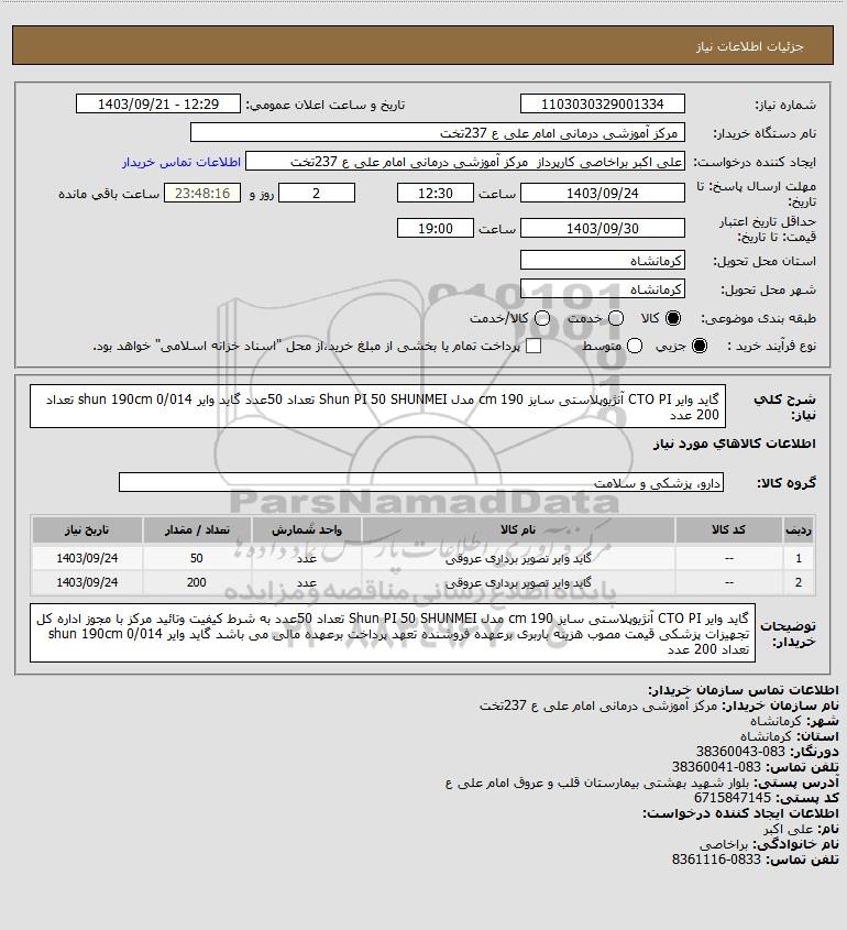 شرح کلی نیاز: گاید وایر CTO PI آنژیوپلاستی سایز 190 cm مدل Shun PI 50 SHUNMEI تعداد 50عدد