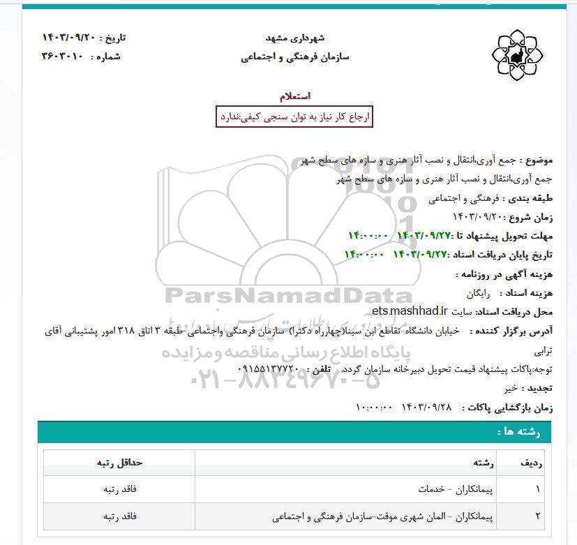 2- رشته پیمانکاران - المان شهری موقت - سازمان فرهنگی و اجتماعی حداقل رتبه فاقد رتبه