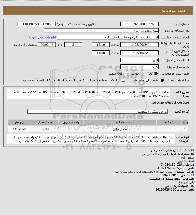شرح کلی نیاز: صافی دیالیز/PS130 تعداد 960 عدد/PS10 تعداد 120 عدد/PS180 تعداد 120 عدد/PS13 تعداد 960 عدد /PS16 تعداد 960 عدد/PS160 تعداد 240 عدد