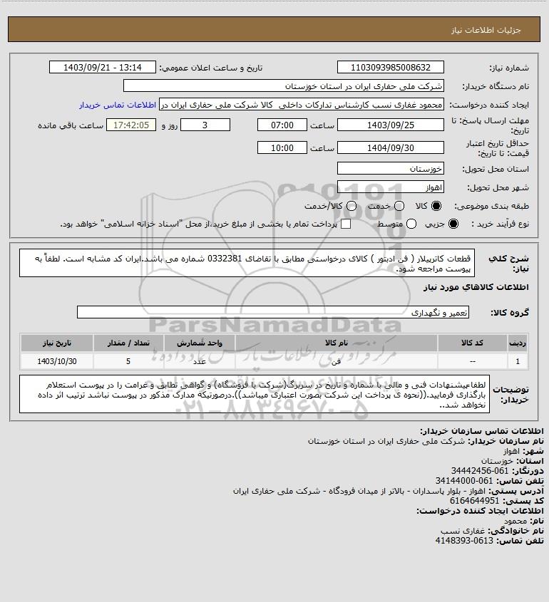 شرح کلی نیاز: قطعات کاترپیلار ( فن ادبتور ) کالای درخواستی مطابق با تقاضای 0332381 شماره می باشد.ایران کد مشابه است. لطفاً به پیوست مراجعه شود.