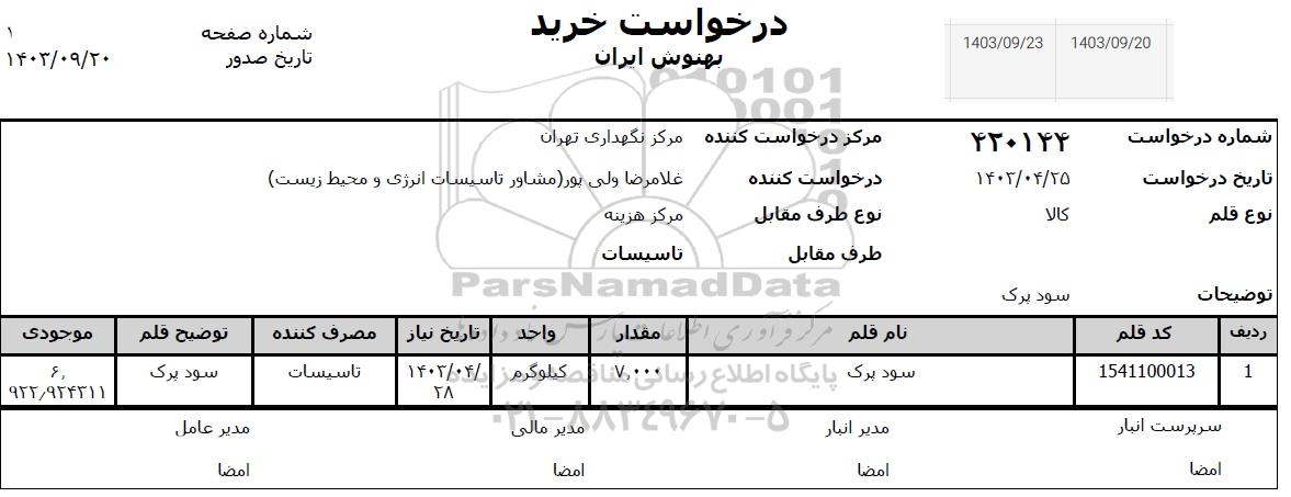 | 1 | 1541100013 | سود پرک | 7.000 | کیلوگرم | 1403.4.28 | تاسیسات | 6.922.924.311 |