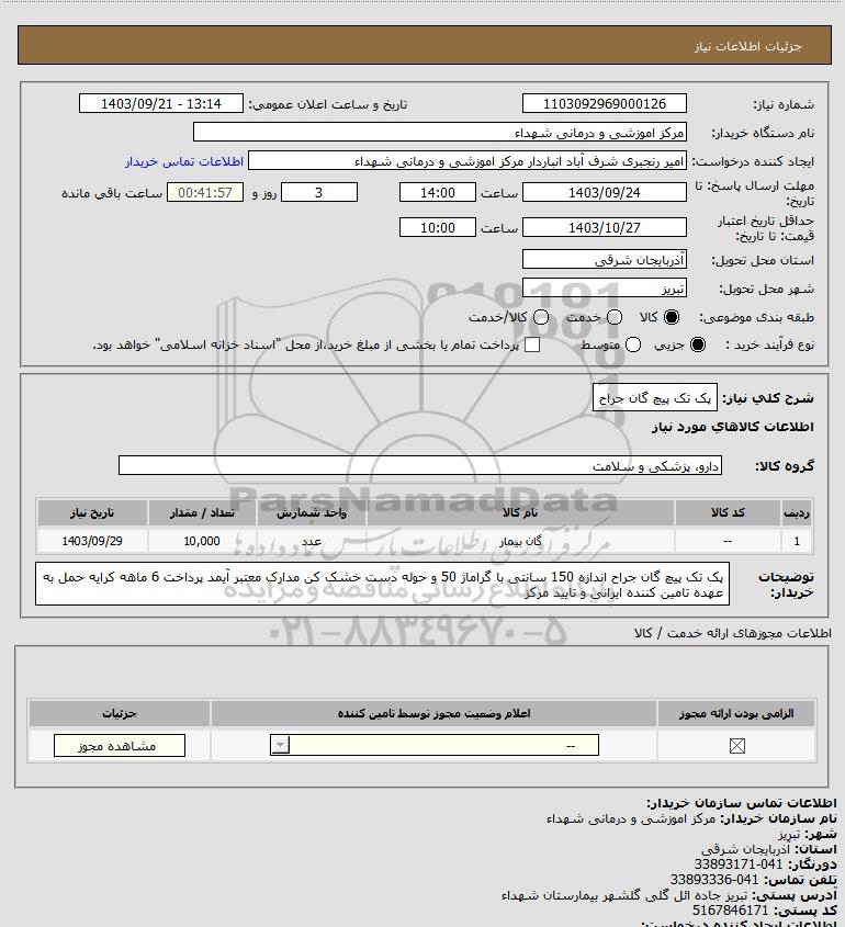 | 1 | -- | گان بیمار | عدد | 10,000 | 1403/09/29 |