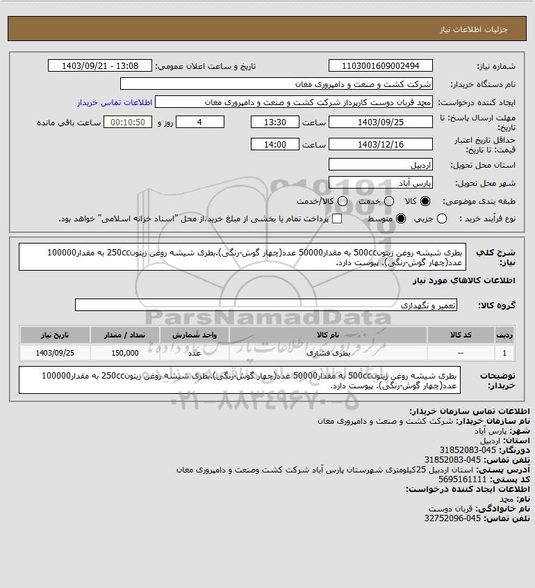 | 1 | -- | بطری فشاری | عدد | 150,000 | 1403/09/25 |