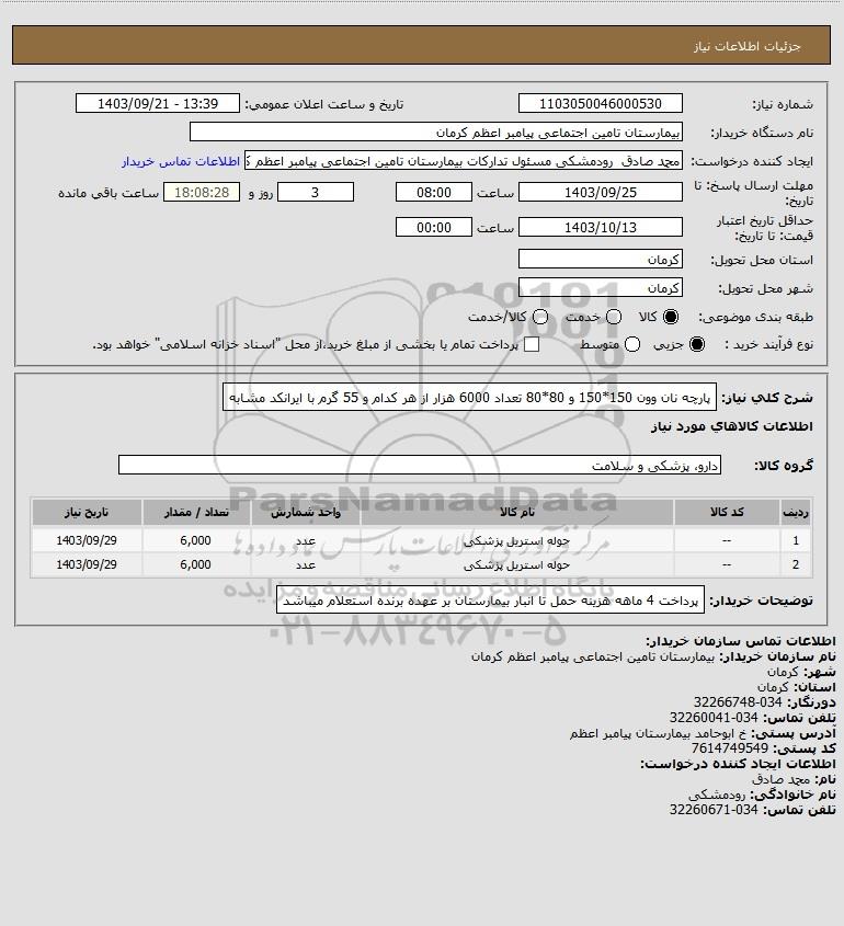 | 1 | -- | حوله استریل پزشکی | عدد | 6,000 | 1403/09/29 |