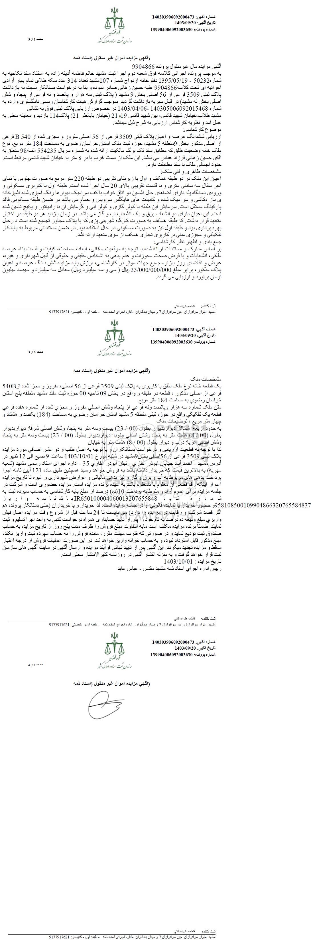 مزایده پلاک ثبتی 3509 فرعی از 56 اصلی