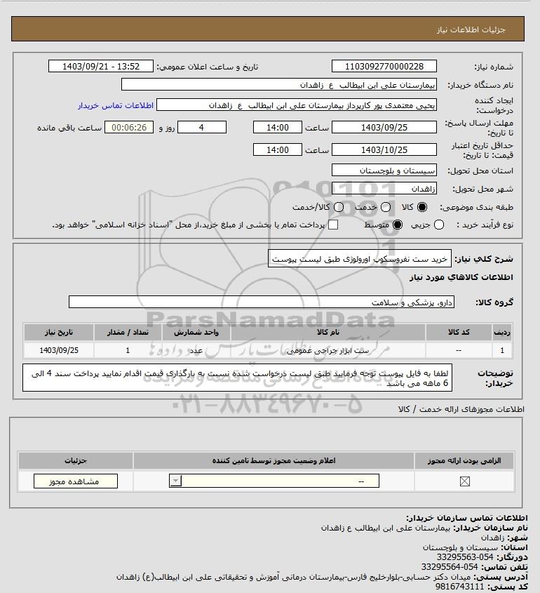شرح کلی نیاز: خرید ست نفروسکوپ اورولوژی طبق لیست پیوست