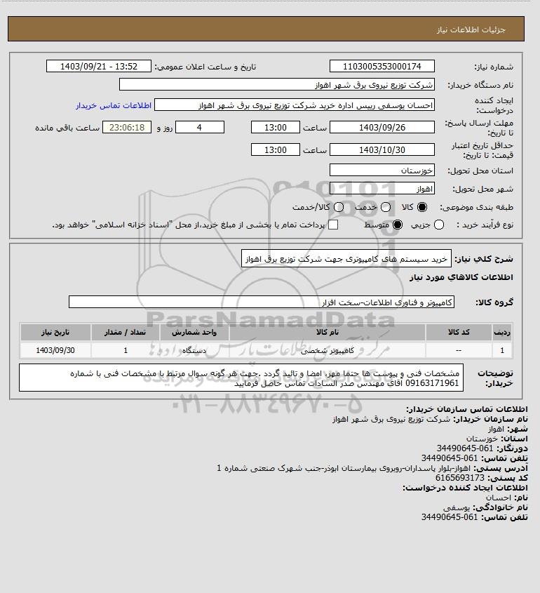 شرح کلی نیاز: خرید سیستم های کامپیوتری جهت شرکت توزیع برق اهواز