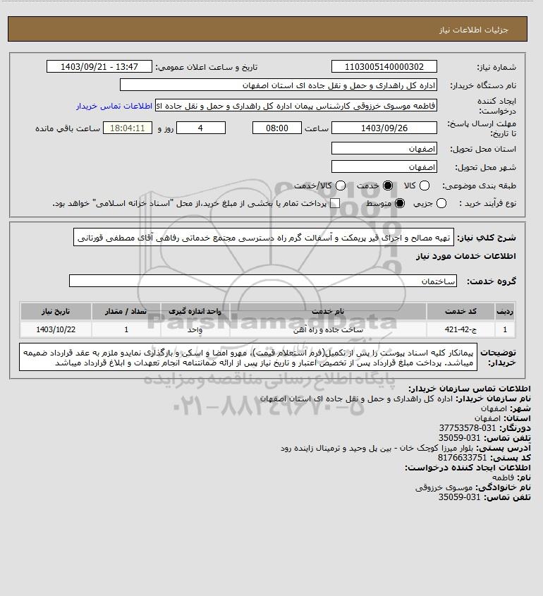 شرح کلی نیاز: تهیه مصالح و اجرای قیر پریمکت و آسفالت گرم راه دسترسی مجتمع خدماتی رفاهی آقای مصطفی قورتانی