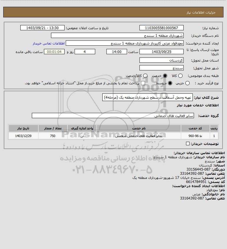 شرح کلی نیاز: تهیه وحمل آسفالت درسطح شهرداری منطقه یک (مرحله4)