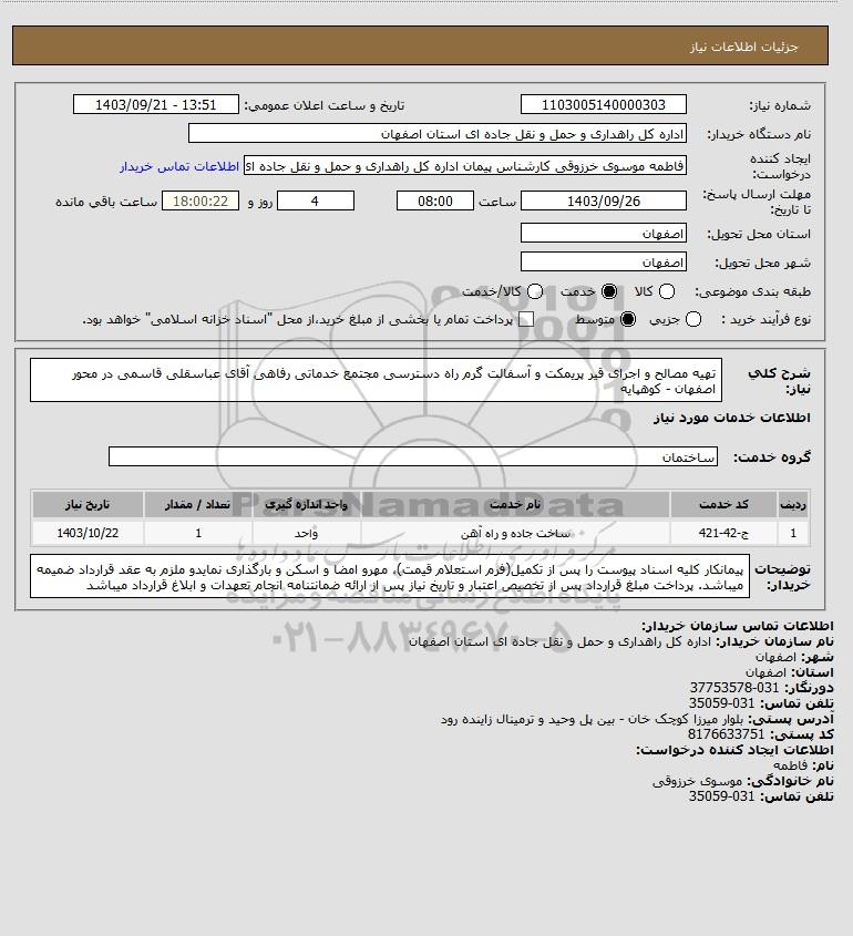شرح کلی نیاز: تهیه مصالح و اجرای قیر پریمکت و آسفالت گرم راه دسترسی مجتمع خدماتی رفاهی آقای عباسقلی قاسمی در محور اصفهان - کوهپایه