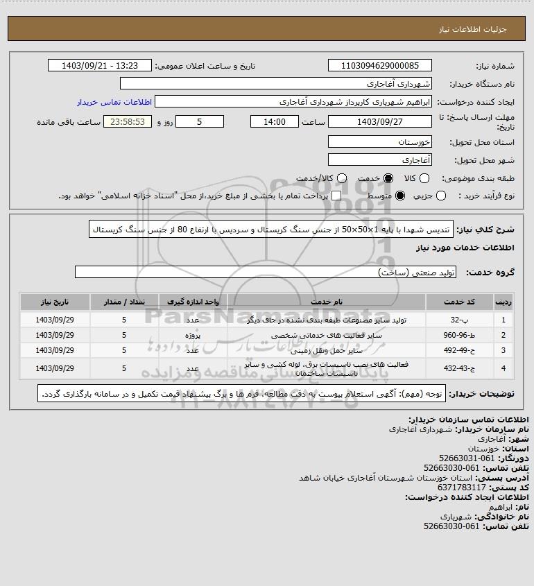 شرح کلی نیاز: تندیس شهدا با پایه 1×50×50 از جنس سنگ کریستال و سردیس با ارتفاع 80 از جنس سنگ کریستال