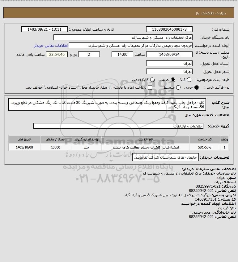 شرح کلی نیاز: کلیه مراحل چاپ ,تهیه کاغذ ومقوا زینک وصحافی وبسته بندی به صورت شیرینگ 30جلدی کتاب تک رنگ مشکی در قطع وزیری 56صفحه وجلد 4رنگ