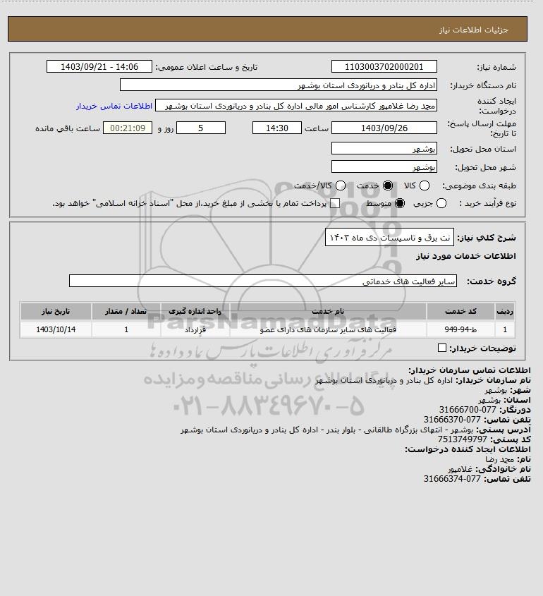 شرح کلی نیاز: نت برق و تاسیسات دی ماه ۱۴۰۳