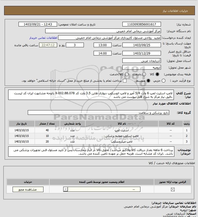 شرح کلی نیاز: لامپ اسلیت لمپ 6 ولت 5/4 آمپر و لامپ اتوسکوپ دیواری هاین 3.5 ولت کد X-002.88.078 باتوجه مشابهت ایران کد لیست دقیق نیاز مرکز به شرح فایل پیوست می باشد