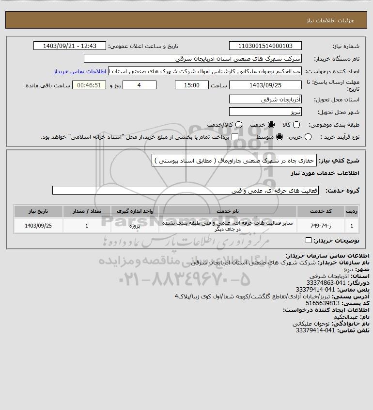 شرح کلی نیاز: حفاری چاه در شهرک صنعتی چاراویماق ( مطابق اسناد پیوستی )