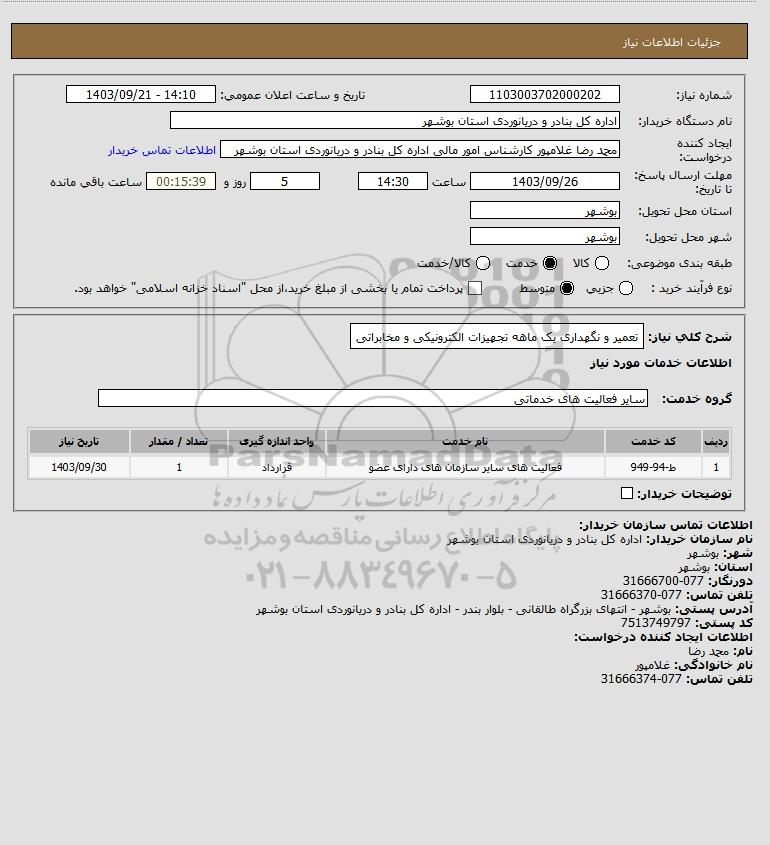 شرح کلی نیاز: تعمیر و نگهداری یک ماهه تجهیزات الکترونیکی و مخابراتی