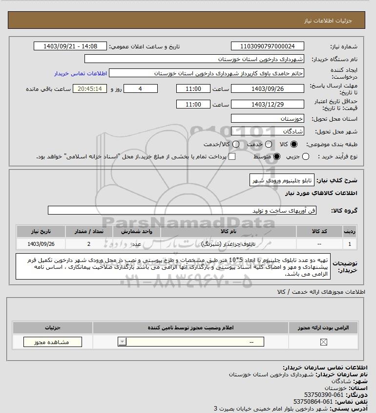 توضیحات خریدار:تهیه دو عدد تابلوی چلینیوم با ابعاد 5*10 متر طبق مشخصات و طرح پیوستی و نصب در محل ورودی شهر دارخوین تکمیل فرم پیشنهادی و مهر و امضای کلیه اسناد پیوستی و بارگذاری آنها الزامی می باشد بارگذاری صلاحیت پیمانکاری ، اساس نامه الزامی می باشد.