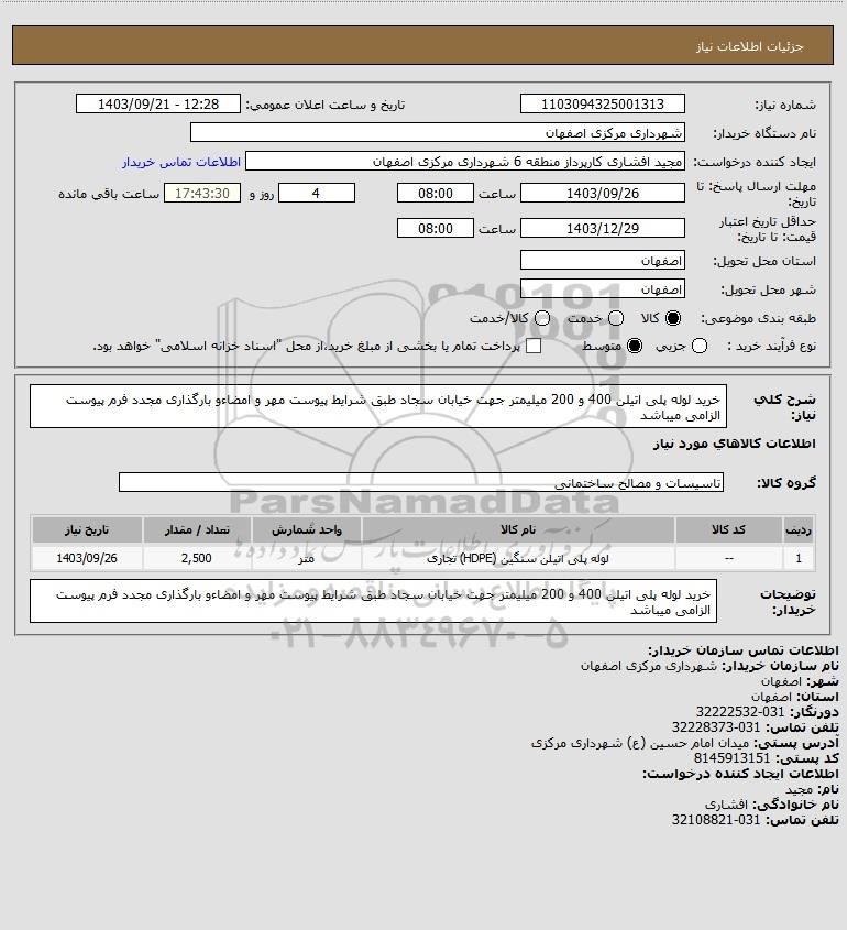 شرح کلی نیاز: خرید لوله پلی اتیلن 400 و 200 میلیمتر جهت خیابان سجاد طبق شرایط پیوست