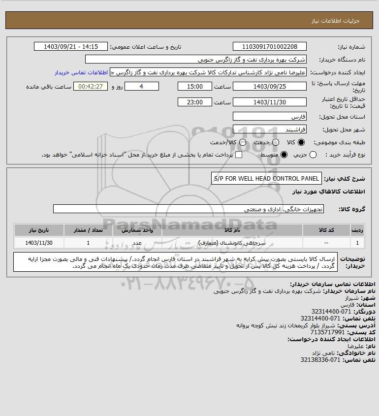 شرح کلی نیاز: S/P FOR WELL HEAD CONTROL PANEL