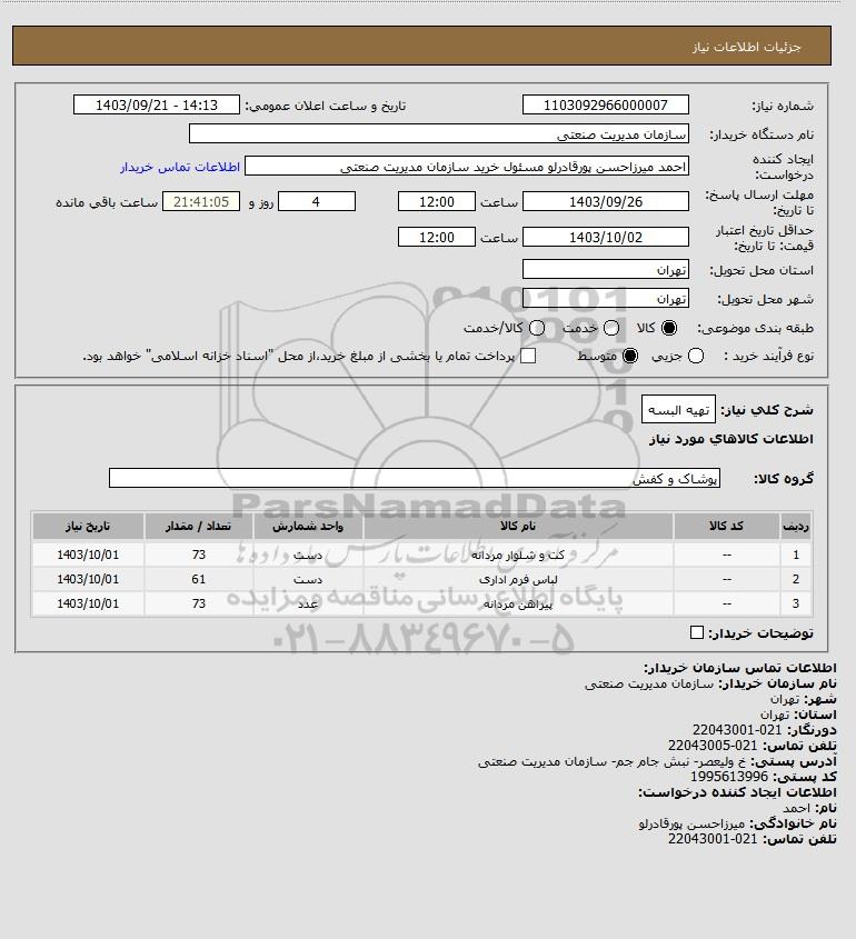 استعلام بها و موضوع استعلام استعلام تهیه البسه به اطلاع کلیه شرکت‌ها و افراد متخصص واجد شرایط می‌رساند، آگهی گذار در نظر دارد از طریق استعلام بها، نسبت به انتخاب و دریافت پیشنهادات اقدام نماید. این استعلام با کد آگهی ثبت شده در سامانه خبرگزاری پارس نماد : 8395494 منتشر شده است. مشخصات استعلام : تاریخ شروع استعلام: 1403/09/21 آخرین مهلت ارسال پیشنهاد قیمت : 1403/09/26 و محل اجرای پروژه : استان تهران میباشد. استعلام قیمت مورد درخواست : استعلام تهیه البسه با دسته‌بندی‌های تخصصی و گروه های مرتبط : البسه و پوشاک, استعلام اطلاع رسانی میگردد.