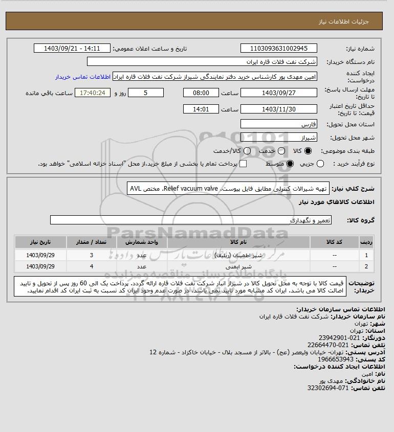 شرح کلی نیاز: تهیه شیرالات کنترلی مطابق فایل پیوست. Relief vacuum valve. مختص AVL
