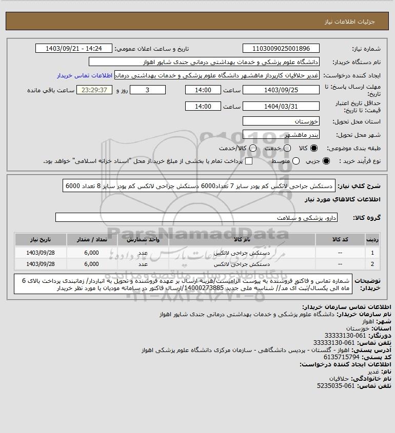 | 1 | -- | دستکش جراحی لاتکس | عدد | 6,000 | 1403/09/28 |