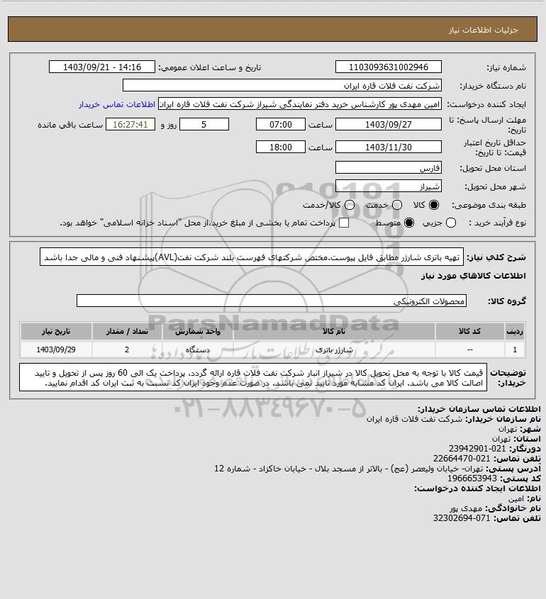 شرح کلی نیاز: تهیه باتری شارژر مطابق فایل پیوست.مختص شرکتهای فهرست بلند شرکت نفت(AVL)پیشنهاد فنی و مالی جدا باشد