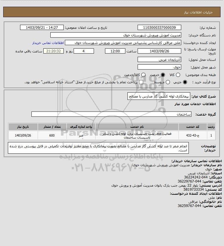 استعلام پیمانکاری لوله کشی گاز مدارس با مصالح, استعلام پیمانکاری لوله کشی گاز مدارس با مصالح