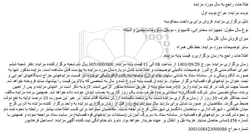 زمان برگزاری مزایده: مورخ 1403/09/29 از ساعت 08 الی 11 قیمت پایه مزایده: 305/000/000 ریال نام شعبه برگزارکننده مزایده: دفتر شعبه ششم اجرای احکام مدنی کرج البرز توضیحات تکمیلی توضیحات و اطلاعات کامل درباره مال مورد مزایده به پیوست قابل مشاهده است. مزایده مذکور تنها به صورت الکترونیکی و در سامانه ستاد به نشانی سایت ستاد ایران) سامانه تدارکات الکترونیکی دولت)، در قسمت مزایدههای حراج دستگاههای اجرایی و تحت عنوان مزایدههای قوه قضائیه برگزار میشود. مزایده از قیمت پایه شروع شده و مال به شخصی که بالاترین قیمت را پیشنهاد نماید فروخته خواهد شد. ضمناً جهت شرکت در فرایند مزایده واریز 10درصد مبلغ پایه از طریق سامانه مذکور الزامی است. لازم به ذکر است در انتهای مزایده و پس از تعیین برنده، مبالغ تضمین سایر شرکت کنندگان(به استثنای برنده) ظرف مدت یک روز کاری به حساب ایشان عودت داده خواهد شد. همچنین برنده مزایده مکلف است حداکثر ظرف 30 روز از زمان برگزاری مزایده نسبت به پرداخت باقیمانده ارزش معامله اقدام نماید. در غیر این صورت 10 درصد اولیه به نفع دولت ضبط می گردد. متقاضیان در صورت تمایل برای بازدید مال میتوانند پنج روز قبل از زمان برگزاری مزایده به واحد برگزار کننده مزایده به آدرس کرج میدان طالقانی - شهرک اداری - ساختمان دادگستری شهرستان کرج مراجعه نمایند. متقاضیان میتوانند برای کسب اطلاعات بیشتر در رابطه با نحوه ثبت نام و نحوه شرکت در مزایدههای قوه قضائیه در سامانه ستاد به سربرگ آموزش (مستندات مزایدههای قوه قضائیه) در سایت ستاد مراجعه نموده و همچنین با شماره 1456تماس حاصل نمایند. هزینه نقل و انتقال بر عهده خریدار خواهد بود. نام و نام خانوادگی ثبت کننده آگهی مزایده: اسماعیل فرهادپور