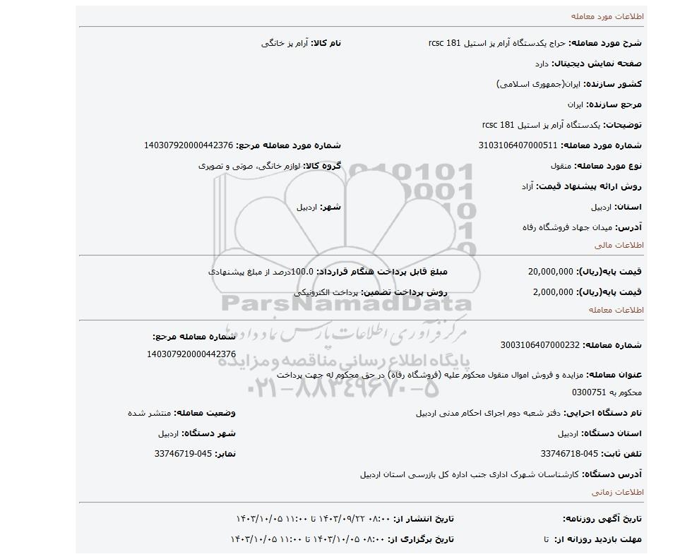 شرح مورد معامله: حراج یکدستگاه آرام پز استیل 181 rcsc | نام کالا: آرام پز خانگی | |