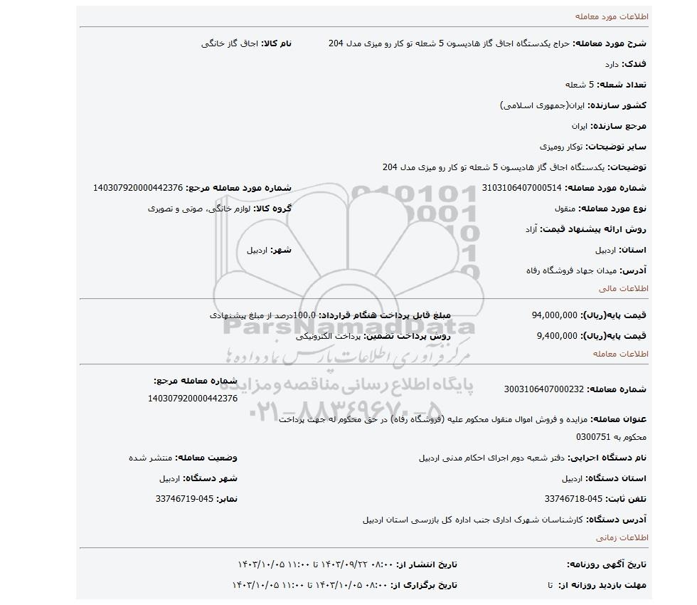 مکان برگزاری اموال واگذاری استانهای اردبیل و دستهبندیهای مربوط به این حراجی متفرقه میباشد.