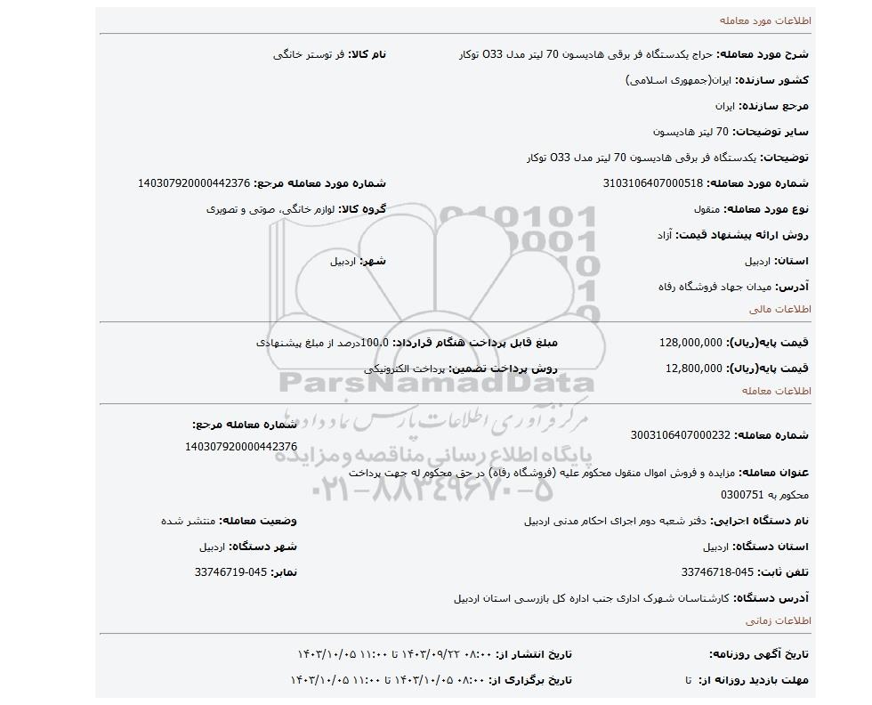 نام دستگاه اجرایی: دفتر شعبه دوم اجرای احکام مدنی اردبیل | وضعیت معامله: منتشر شده | |