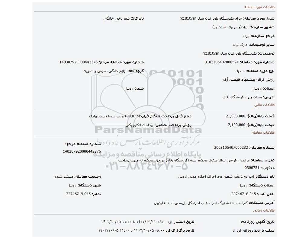 نام دستگاه اجرایی: دفتر شعبه دوم اجرای احکام مدنی اردبیلوضعیت معامله: منتشر شده