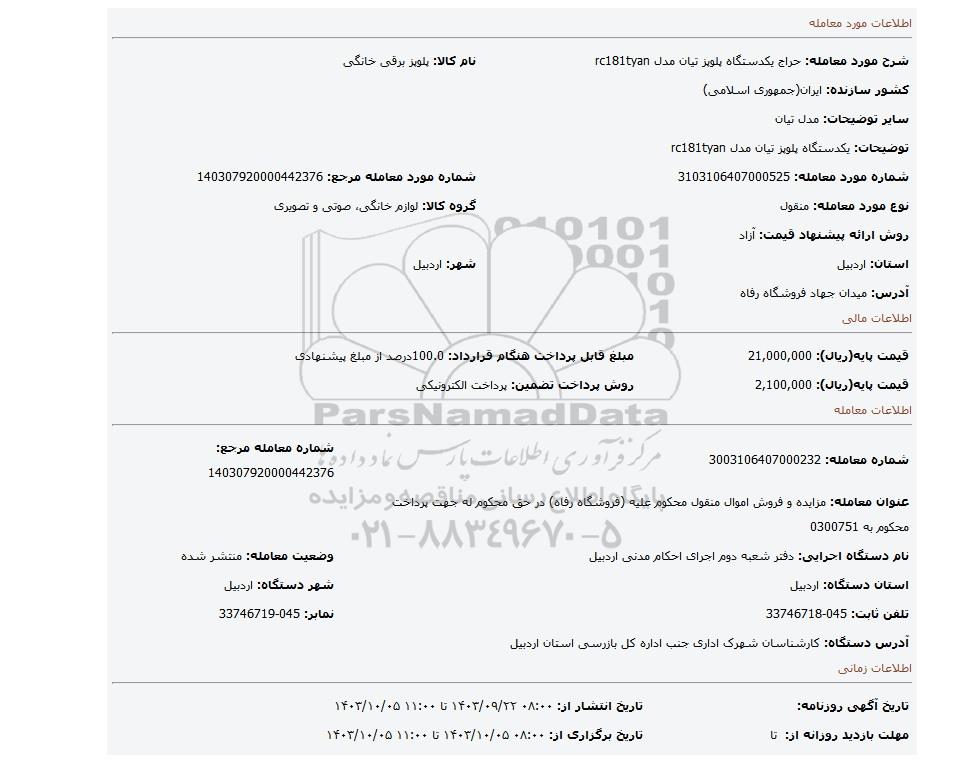 مزایده یکدستگاه پلوپز تیان مدل rc181tyan, مزایده، یکدستگاه پلوپز تیان مدل rc181tyan