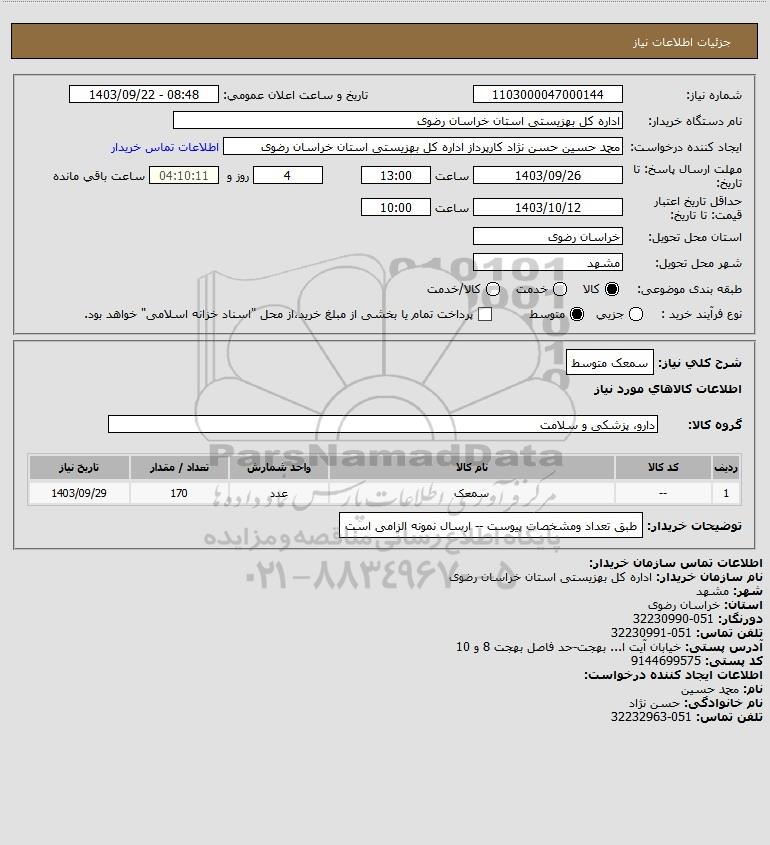 استعلام بها و موضوع استعلام استعلام سمعک متوسط به اطلاع کلیه شرکتها و افراد متخصص واجد شرایط میرساند، آگهی گذار در نظر دارد از طریق استعلام بها، نسبت به انتخاب و دریافت پیشنهادات اقدام نماید. این استعلام با کد آگهی ثبت شده در سامانه خبرگزاری پارس نماد : 8397507 منتشر شده است. مشخصات استعلام : تاریخ شروع استعلام: 1403/09/22 آخرین مهلت ارسال پیشنهاد قیمت : 1403/09/26 و محل اجرای پروژه : استان مناقصات استان خراسان رضوی میباشد. استعلام قیمت مورد درخواست : استعلام سمعک متوسط با دستهبندیهای تخصصی و گروه های مرتبط : خدمات و تجهیزات آزمایشگاهی و پزشکی, استعلام اطلاع رسانی میگردد.