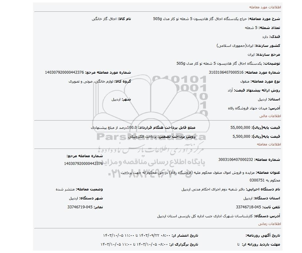 مزایده عمومی مزایده یکدستگاه اجاق گاز هادیسون 5 شعله تو کار مدل 505g برگزار میگردد. از کلیه افراد متخصص و شرکت‌های واجد شرایط دعوت به عمل می‌آید تا در این مزایده با کد خبرگزاری پارس نماد : 8397523 شرکت نمایند تاریخ شروع مزایده : 1403/09/22 مهلت شرکت در مزایده: تا پایان روز 1403/10/05 مکان برگزاری اموال واگذاری استان‌های اردبیل و دسته‌بندی‌های مربوط به این حراجی متفرقه میباشد. اطلاعات دقیق‌تر درباره شرایط شرکت در مزایده آنلاین و نحوه ارسال مدارک، الزامات پروژه و دریافت اسناد مزایده و تاریخ بازگشایی پاکت‌ها، در بخش اطلاعات تکمیلی این آگهی درج شده است.