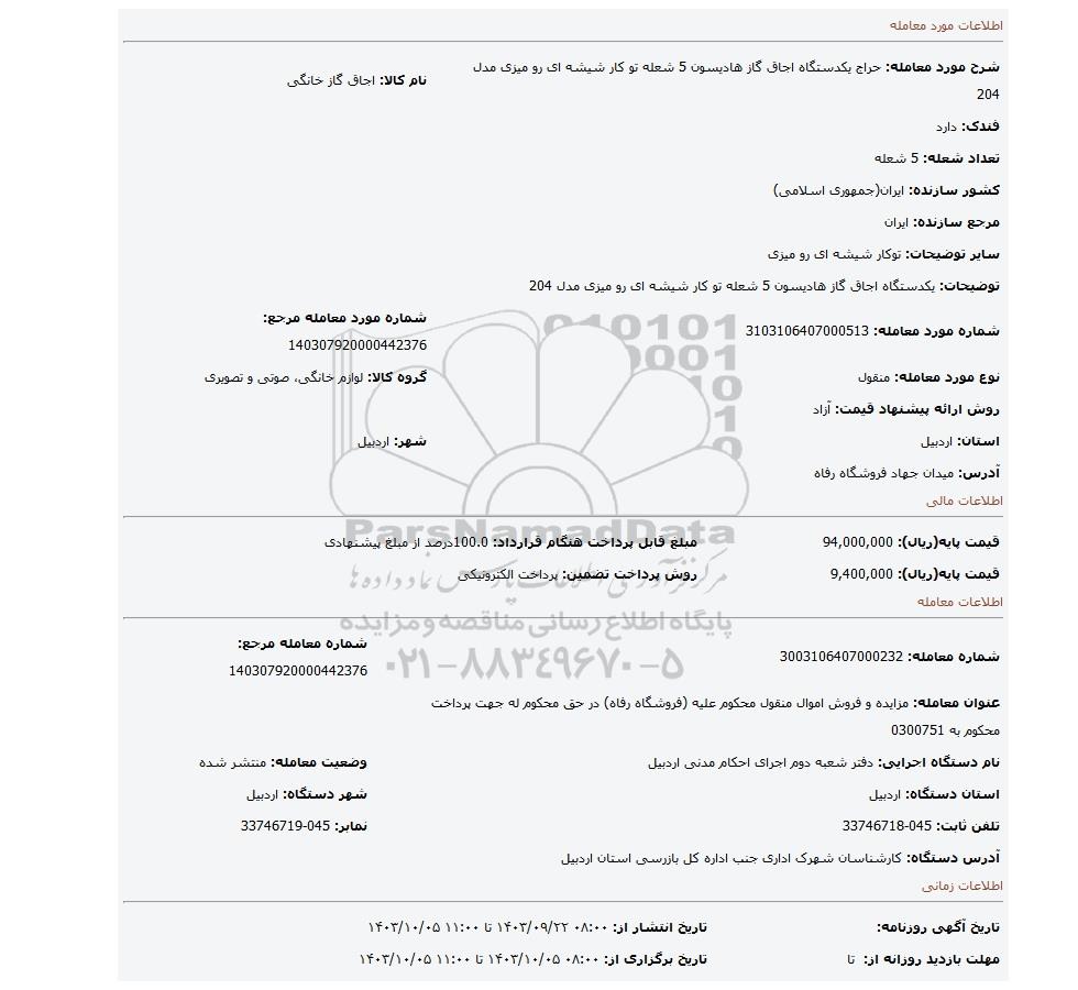 نام دستگاه اجرایی: دفتر شعبه دوم اجرای احکام مدنی اردبیل | وضعیت معامله: منتشر شده | |