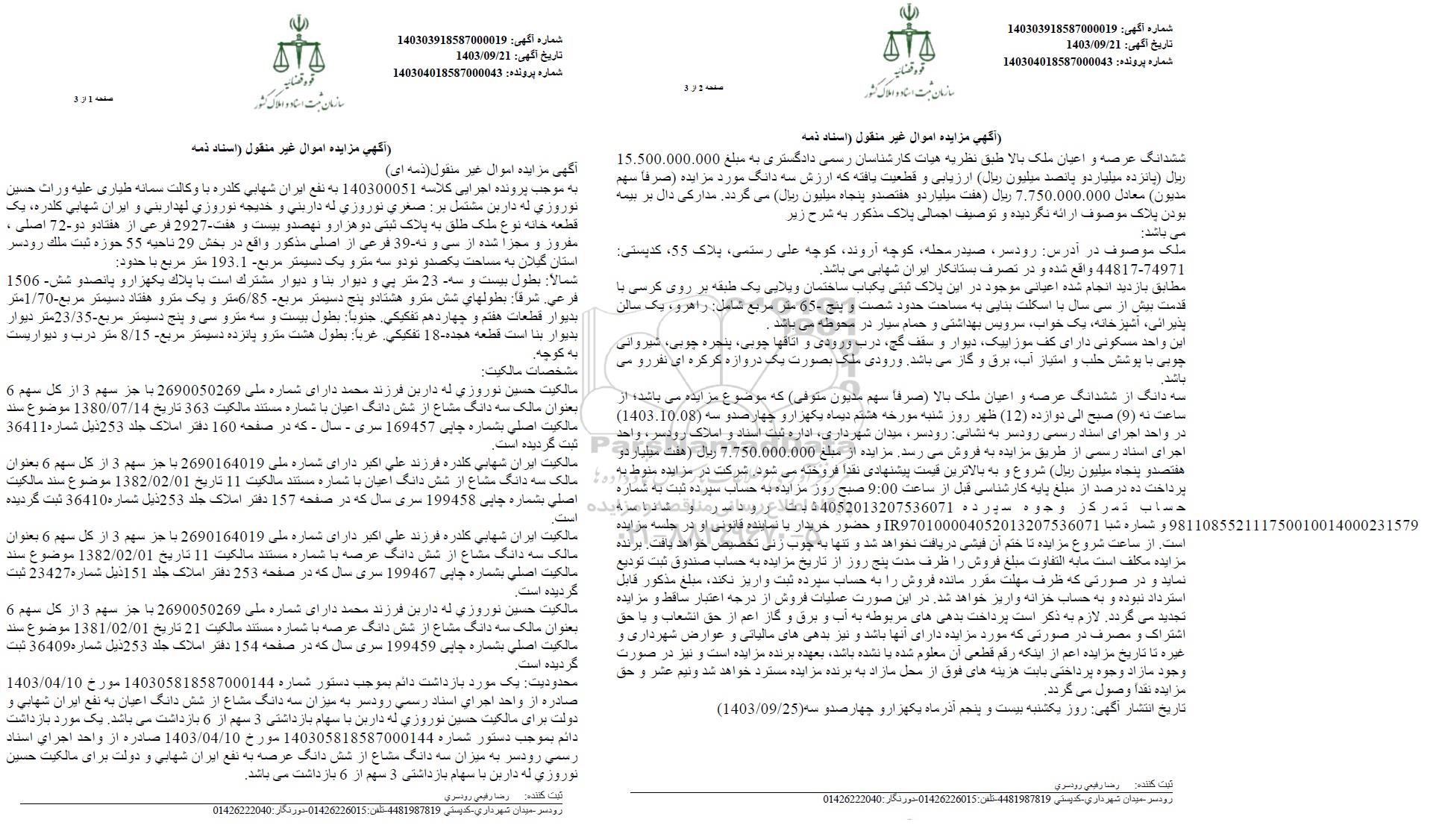 مزایده فروش یک قطعه خانه به پلاک ثبتی 2927 فرعی از 72 اصلی