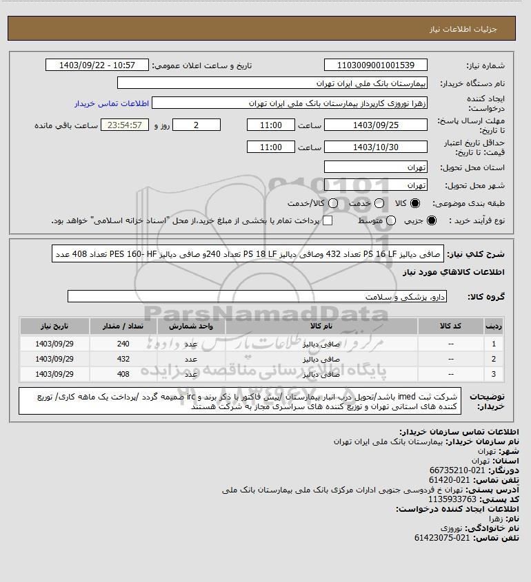 شرح کلی نیاز: صافی دیالیز PS 16 LF تعداد 432 وصافی دیالیز PS 18 LF تعداد 240و صافی دیالیز PES 160- HF تعداد 408 عدد
