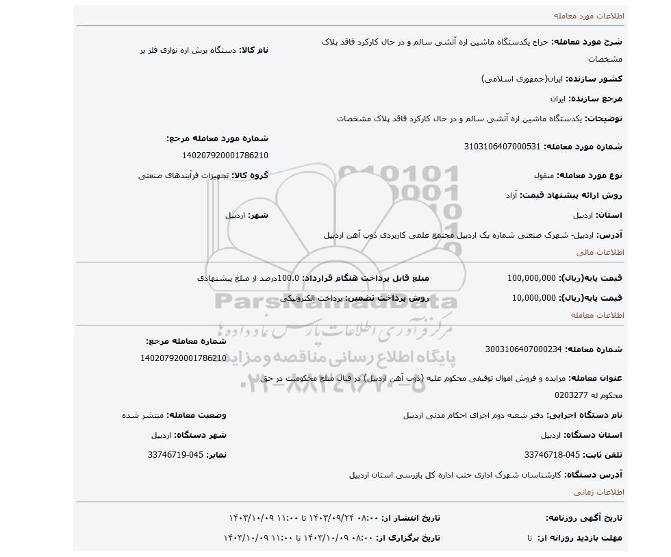 عنوان معامله: مزایده و فروش اموال توقیفی محکوم علیه (ذوب آهن اردبیل) در قبال مبلغ محکومیت در حق محکوم له 0203277 | ||
