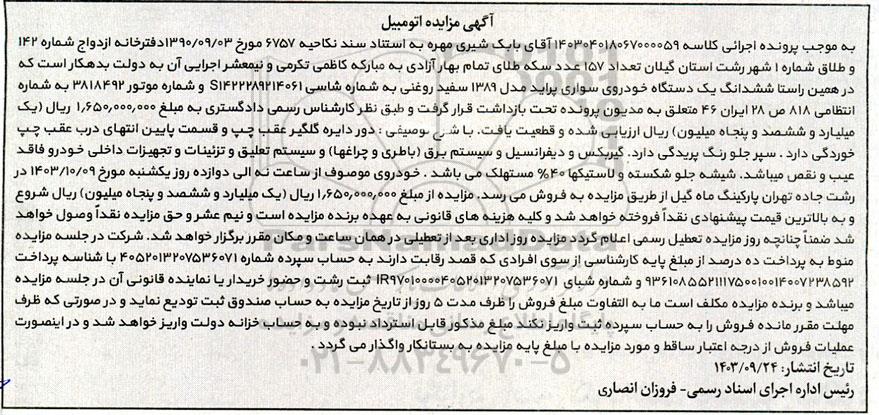 مزایده عمومی مزایده یک دستگاه خودروی سواری پراید مدل 1389 سفید روغنی برگزار میگردد. از کلیه افراد متخصص و شرکت‌های واجد شرایط دعوت به عمل می‌آید تا در این مزایده با کد خبرگزاری پارس نماد : 8400136 شرکت نمایند تاریخ شروع مزایده : 1403/09/24 مهلت شرکت در مزایده: تا پایان روز 1403/10/09 مکان برگزاری اموال واگذاری استان‌های گیلان و دسته‌بندی‌های مربوط به این حراجی انواع خودرو سبک میباشد.