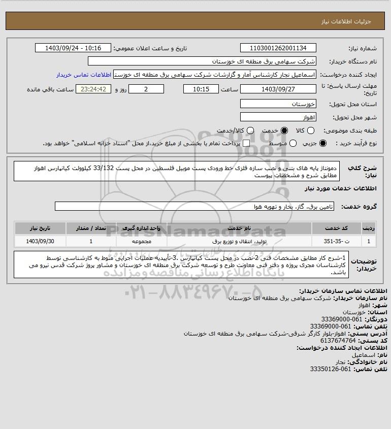 شرح کلی نیاز: دمونتاژ پایه های بتنی و نصب سازه فلزی خط ورودی پست موبیل فلسطین در محل پست 33/132 کیلوولت کیانپارس اهواز مطابق شرح و مشخصات پیوست