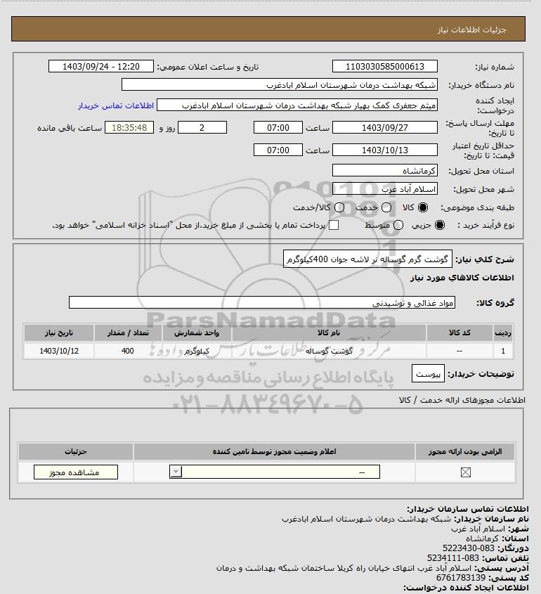شرح کلی نیاز: گوشت گرم گوساله نر لاشه جوان 400کیلوگرم