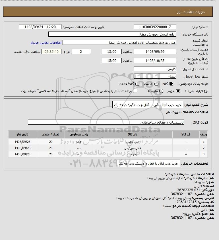 شرح کلی نیاز: خرید درب hpl اتاقی با قفل و دستگیره درجه یک